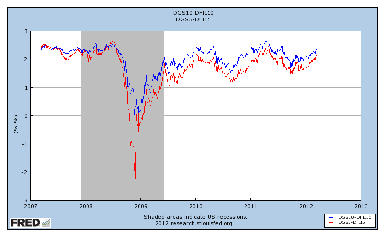 What about measures of anticipated inflation? The next chart shows the breakeven rates implicit in 5-year and 10-year Treasury bond yields and TIPS yields.