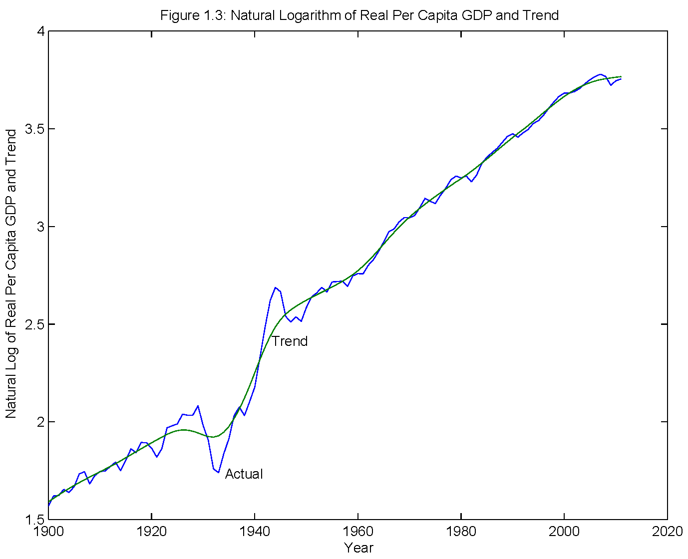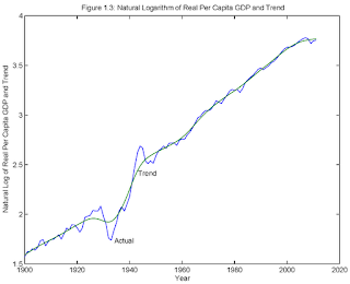 You can see we have to be careful with the HP filter, if we are looking at highly persistent events. You can see this even more clearly for the Great Depression. This next chart is from a revision I am doing for my textbook, showing annual real GDP per capita, with an HP trend (L=100) fit to the actual time series. You can see how the trend moves around substantially in response to the GDP data during the Great Depression and World War II - probably more than you might want it to. Of course that depends on how the smoothing parameter L is chosen. Look at the chart in Krugman's blog post. He's misusing the HP filter here in two ways (though of course what he wants to do is make people who use it look stupid). First, he's using a value for L that's just too small. Second, he's using it to fit a highly persistent event.