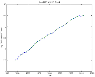 When applied to business cycles, the HP filter finds a smoothed measure of real GDP, which is then taken to represent the economy’s underlying potential, with deviations from this smoothed measure representing unsustainable temporary deviations from potential.I'm not sure if this is just Krugman's misunderstanding, or if this is widespread. In any case, it seems important to correct the misunderstanding.