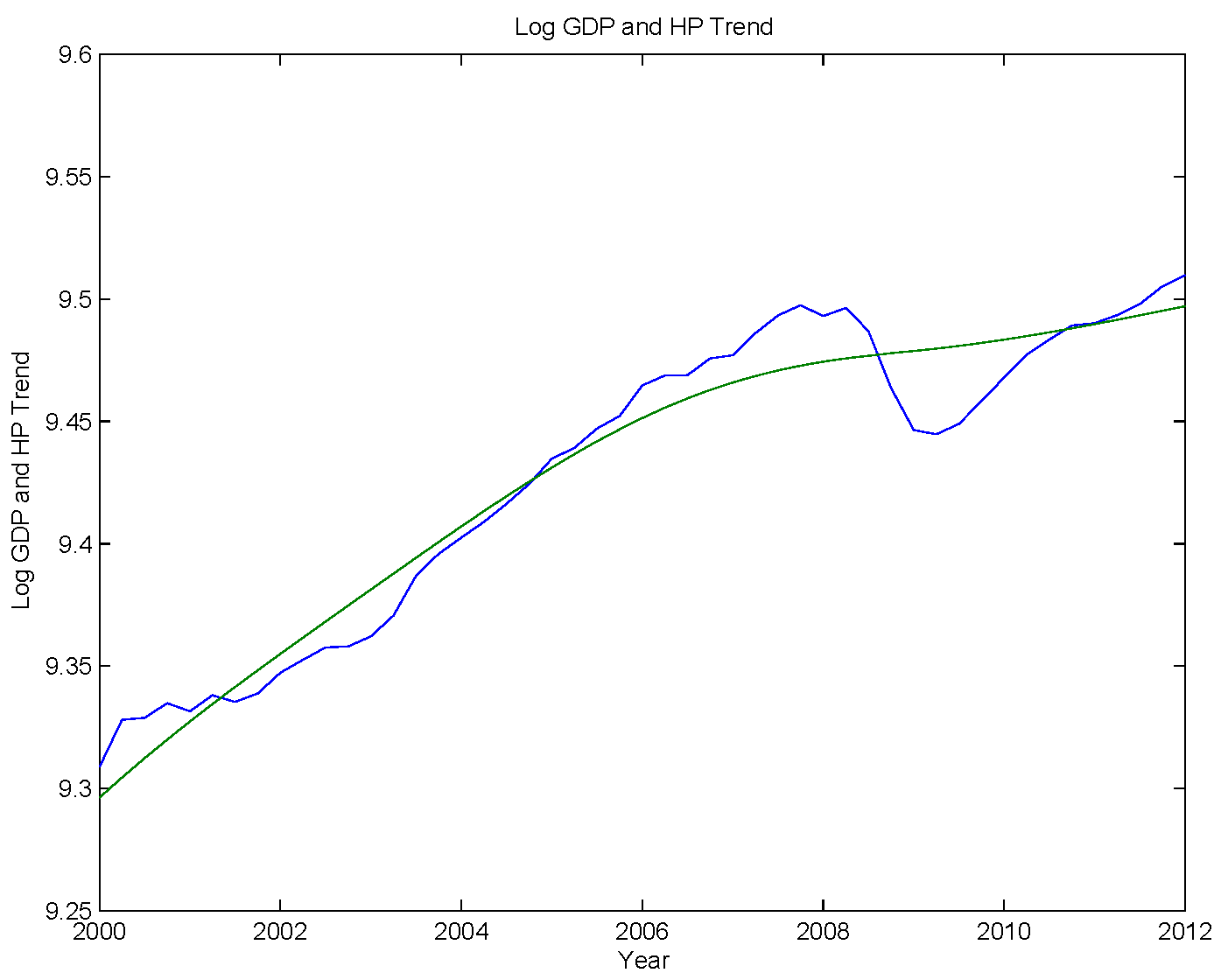 Here's what happens when you HP filter the quarterly real GDP data available on FRED. The first chart shows the log of real GDP and the HP trend. You can see in the chart how the growth trend changes over time to fit the time series.