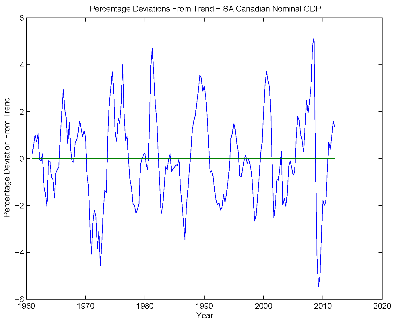 Here's another problem. There is a substantial source of variability in real and nominal GDP that we rarely think about, as we are always staring at seasonally adjusted data. Indeed, the Bureau of Economic Analysis makes it really hard to stare at unadjusted National Income Accounts data. I couldn't unearth it, and had to resort to Statistics Canada which, in their well-ordered Canadian fashion, puts all of these numbers where you expect to find them. The next chart shows the natural logs of Canadian nominal GDP, seasonally adjusted and unadjusted. The seasonal variation in unadjusted NGDP is pretty clear in that picture, but to get an idea of the magnitude, the next two charts show HP-filtered seasonally adjusted and unadjusted Canadian NGDP, respectively.