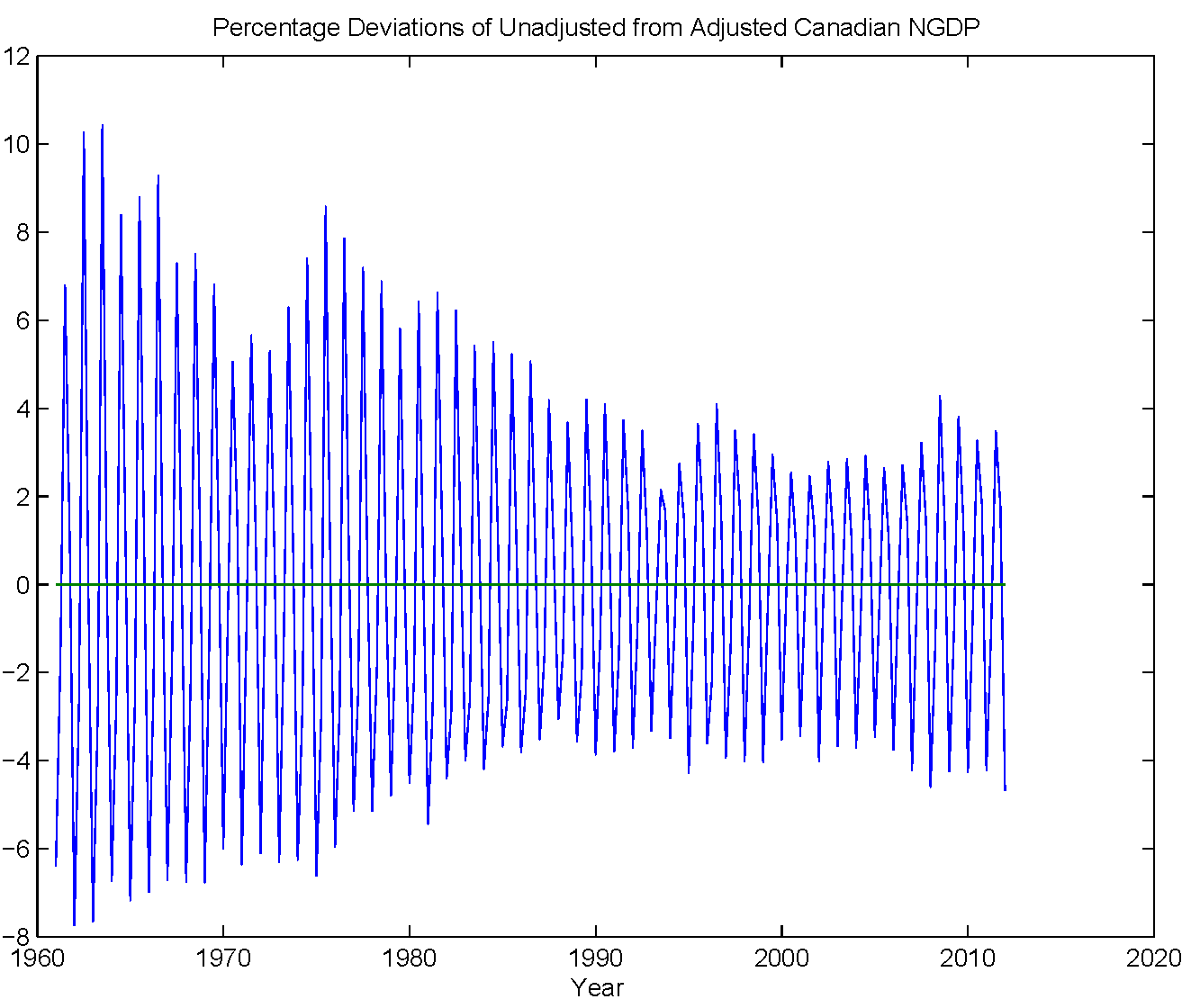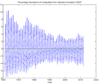 The second chart is interesting, as you can see both the seasonal variation and the cyclical variation in NGDP. If we want just the percentage deviations of unadjusted NGDP from seasonally adjusted NGDP, we get the next chart. There's a substantial amount of variation there - on the order of what we see at business cycle frequencies.